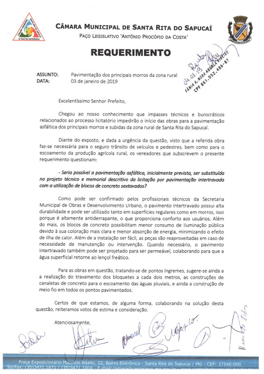 Na última quinta-feira, 03 de janeiro de 2019, um grupo de vereadores elaborou e encaminhou ao prefeito municipal, Prof. Wander Wilson Chaves, documento sugerindo uma solução definitiva para as más condições viárias dos principais morros e subidas da zona rural. Os onze parlamentares que assinaram o Requerimento, questionaram o chefe do Poder Executivo sobre a possibilidade de pavimentar tais vias com bloquetes sextavados de concreto.